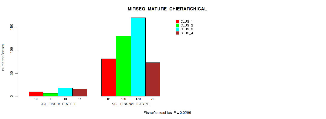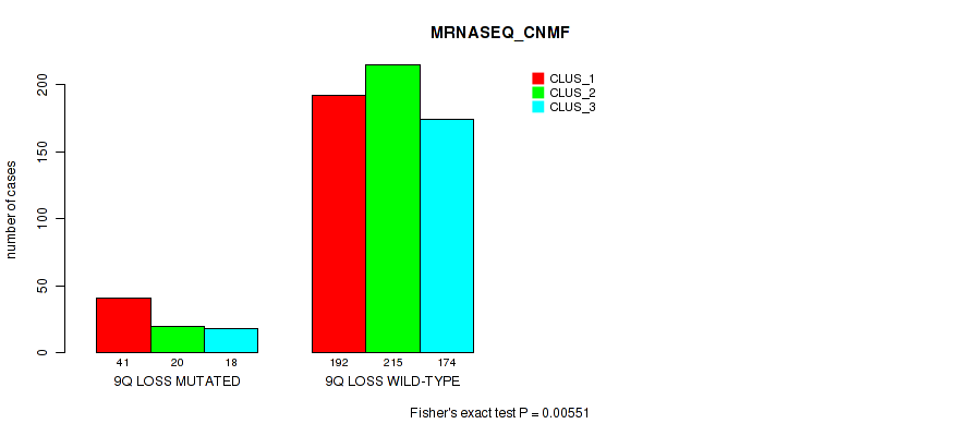9q loss cnv correlated to 'MRNA_CHIERARCHICAL', 'CN_CNMF', 'MRNASEQ_CNMF', 'MRNASEQ_CHIERARCHICAL', and 'MIRSEQ_MATURE_CHIERARCHICAL'.