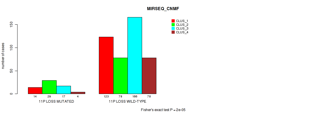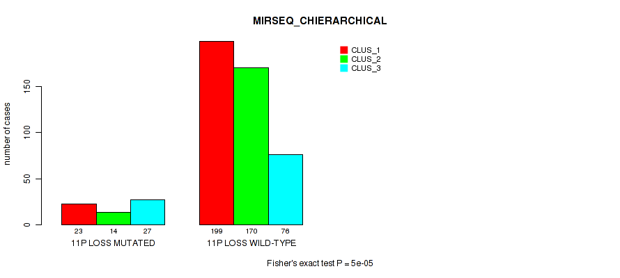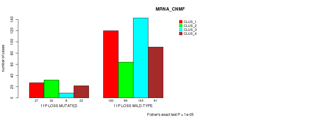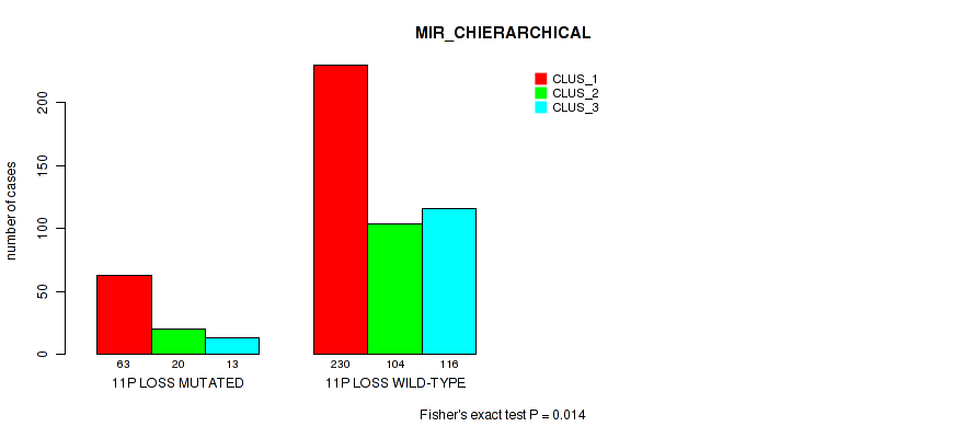 11p loss cnv correlated to 'MRNA_CNMF', 'MRNA_CHIERARCHICAL', 'MIR_CHIERARCHICAL', 'CN_CNMF', 'METHLYATION_CNMF', 'MRNASEQ_CNMF', 'MRNASEQ_CHIERARCHICAL', 'MIRSEQ_CNMF', 'MIRSEQ_CHIERARCHICAL', and 'MIRSEQ_MATURE_CHIERARCHICAL'.