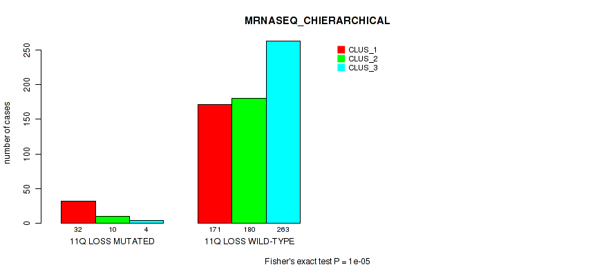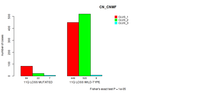 11q loss cnv correlated to 'MRNA_CNMF', 'MRNA_CHIERARCHICAL', 'CN_CNMF', 'METHLYATION_CNMF', 'MRNASEQ_CNMF', 'MRNASEQ_CHIERARCHICAL', 'MIRSEQ_CNMF', 'MIRSEQ_CHIERARCHICAL', and 'MIRSEQ_MATURE_CHIERARCHICAL'.
