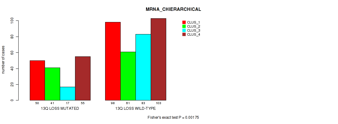 13q loss cnv correlated to 'MRNA_CNMF', 'MRNA_CHIERARCHICAL', 'CN_CNMF', 'METHLYATION_CNMF', 'MRNASEQ_CNMF', 'MRNASEQ_CHIERARCHICAL', and 'MIRSEQ_CHIERARCHICAL'.