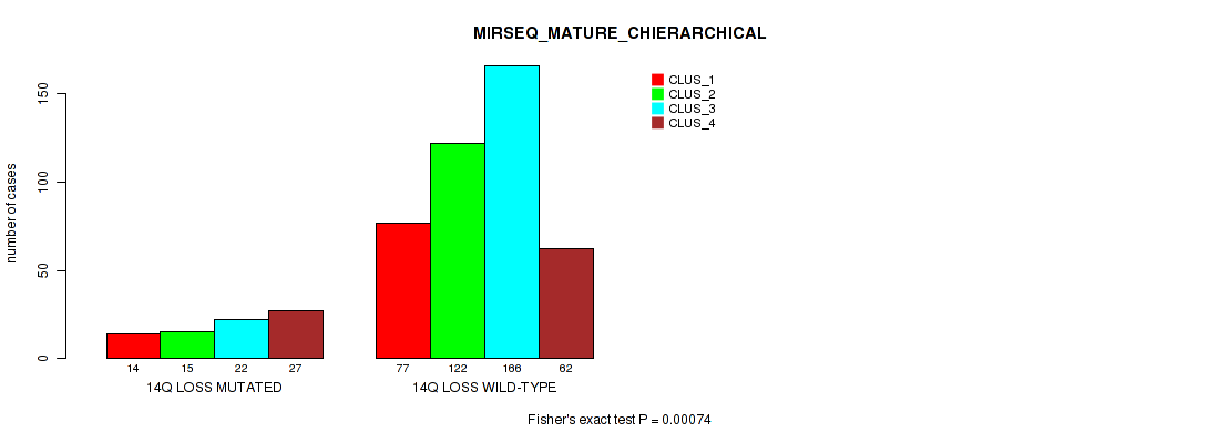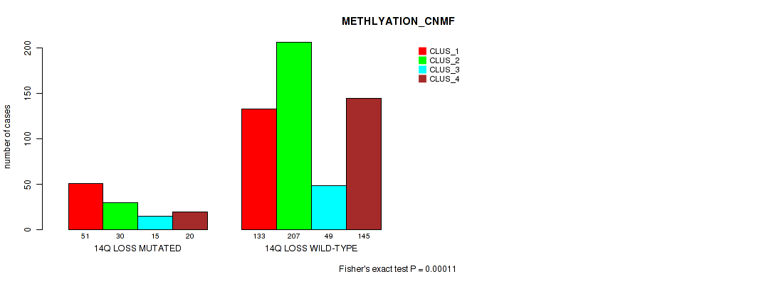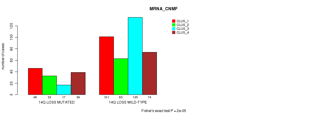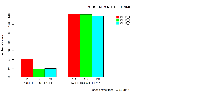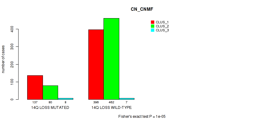 14q loss cnv correlated to 'MRNA_CNMF', 'MRNA_CHIERARCHICAL', 'CN_CNMF', 'METHLYATION_CNMF', 'MRNASEQ_CNMF', 'MRNASEQ_CHIERARCHICAL', 'MIRSEQ_CNMF', 'MIRSEQ_CHIERARCHICAL', 'MIRSEQ_MATURE_CNMF', and 'MIRSEQ_MATURE_CHIERARCHICAL'.