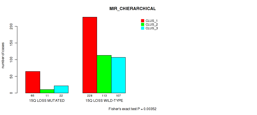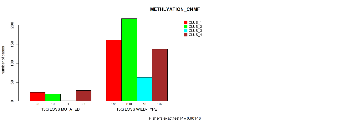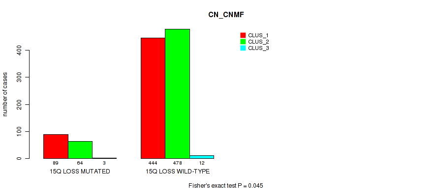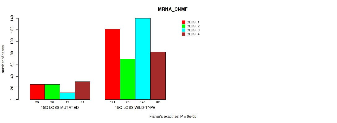 15q loss cnv correlated to 'MRNA_CNMF', 'MRNA_CHIERARCHICAL', 'MIR_CNMF', 'MIR_CHIERARCHICAL', 'CN_CNMF', and 'METHLYATION_CNMF'.