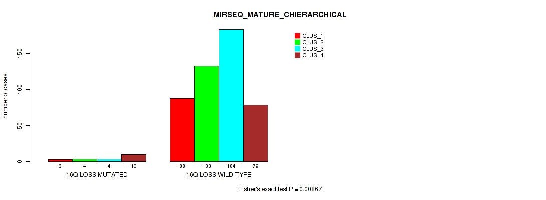 16q loss cnv correlated to 'CN_CNMF', 'METHLYATION_CNMF', 'MRNASEQ_CNMF', 'MRNASEQ_CHIERARCHICAL', 'MIRSEQ_CHIERARCHICAL', and 'MIRSEQ_MATURE_CHIERARCHICAL'.