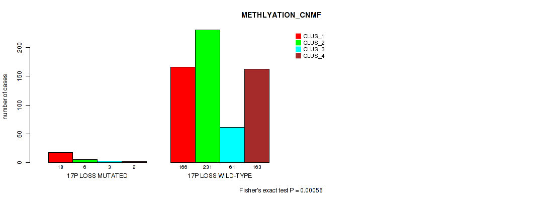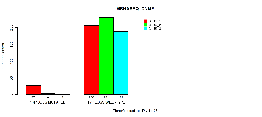 17p loss cnv correlated to 'MRNA_CNMF', 'MRNA_CHIERARCHICAL', 'CN_CNMF', 'METHLYATION_CNMF', 'MRNASEQ_CNMF', 'MRNASEQ_CHIERARCHICAL', 'MIRSEQ_CHIERARCHICAL', and 'MIRSEQ_MATURE_CHIERARCHICAL'.
