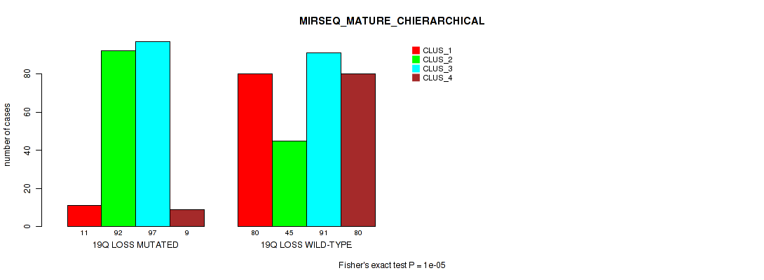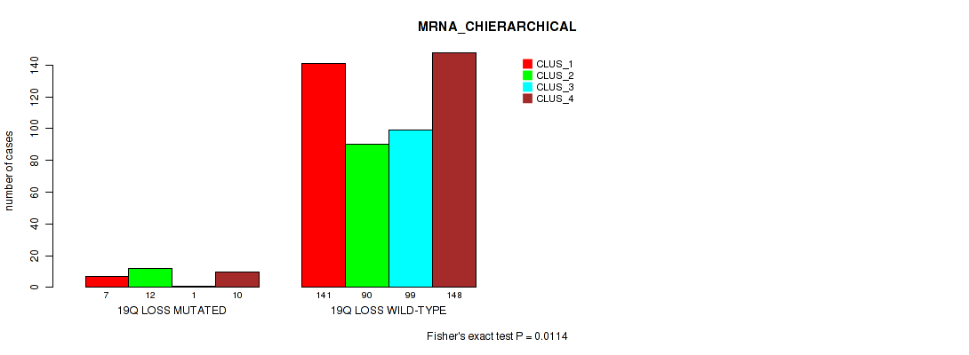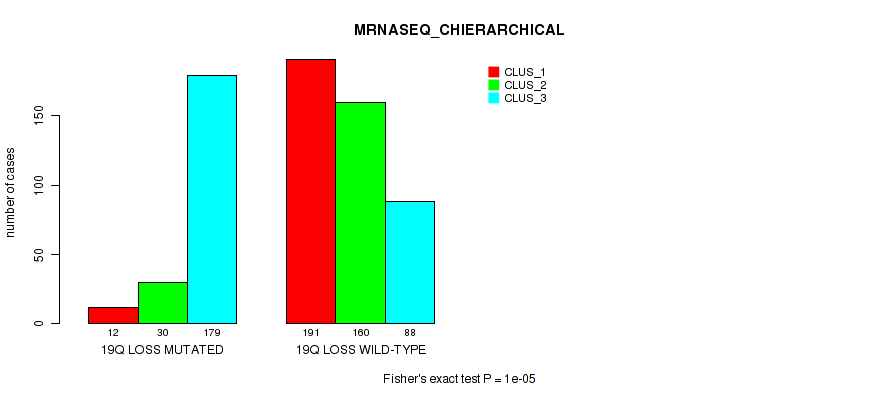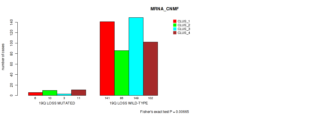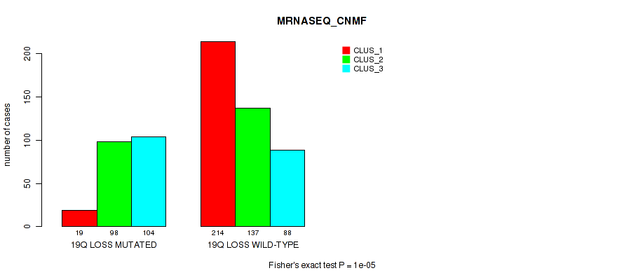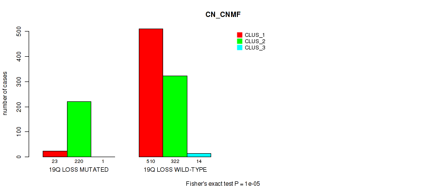 19q loss cnv correlated to 'MRNA_CNMF', 'MRNA_CHIERARCHICAL', 'CN_CNMF', 'METHLYATION_CNMF', 'MRNASEQ_CNMF', 'MRNASEQ_CHIERARCHICAL', 'MIRSEQ_CNMF', 'MIRSEQ_CHIERARCHICAL', 'MIRSEQ_MATURE_CNMF', and 'MIRSEQ_MATURE_CHIERARCHICAL'.