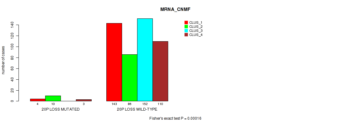 20p loss cnv correlated to 'MRNA_CNMF', 'MRNA_CHIERARCHICAL', and 'MIR_CNMF'.