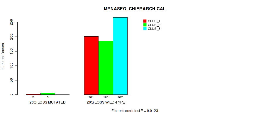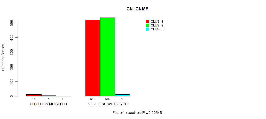 20q loss cnv correlated to 'MRNA_CNMF', 'MRNA_CHIERARCHICAL', 'CN_CNMF', and 'MRNASEQ_CHIERARCHICAL'.