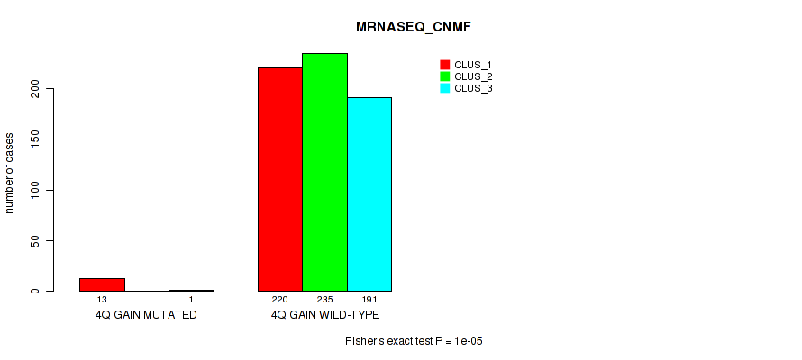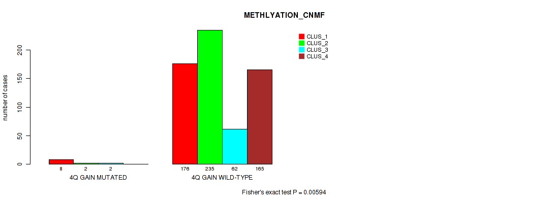 4q gain cnv correlated to 'CN_CNMF', 'METHLYATION_CNMF', 'MRNASEQ_CNMF', and 'MRNASEQ_CHIERARCHICAL'.