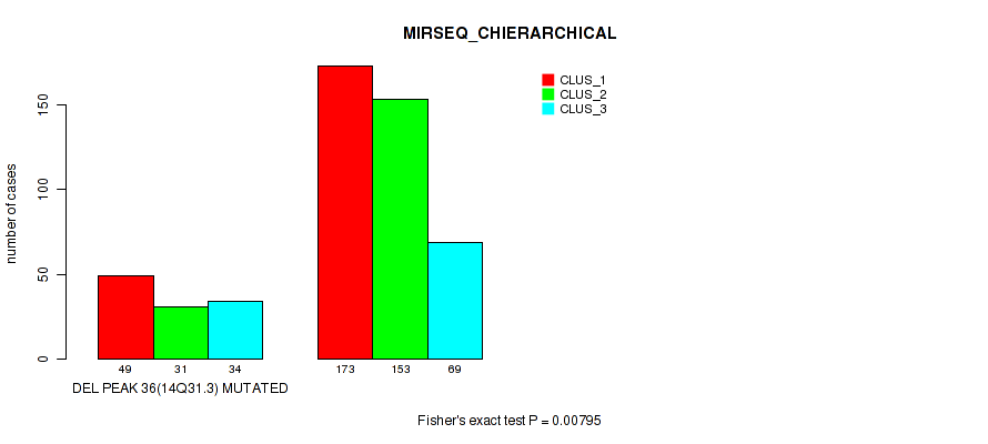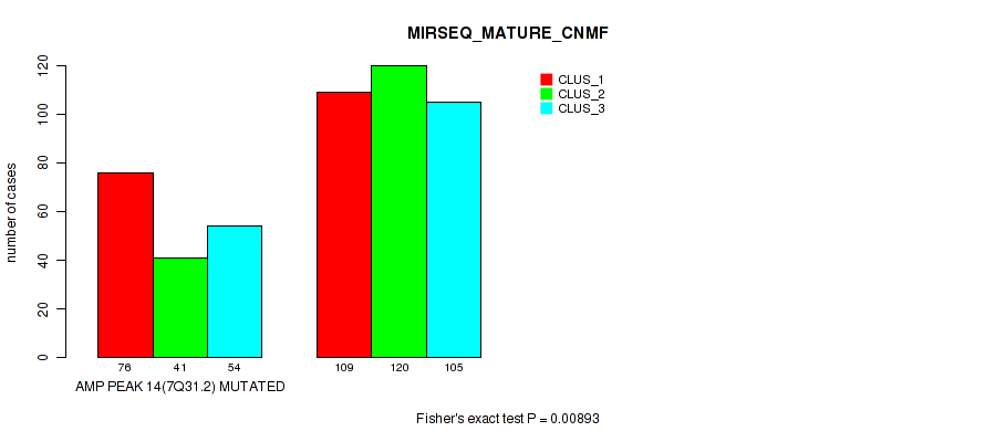 del_14q31.3 cnv correlated to 'MRNA_CNMF', 'MRNA_CHIERARCHICAL', 'CN_CNMF', 'MRNASEQ_CNMF', 'MRNASEQ_CHIERARCHICAL', 'MIRSEQ_CNMF', 'MIRSEQ_CHIERARCHICAL', 'MIRSEQ_MATURE_CNMF', and 'MIRSEQ_MATURE_CHIERARCHICAL'.
