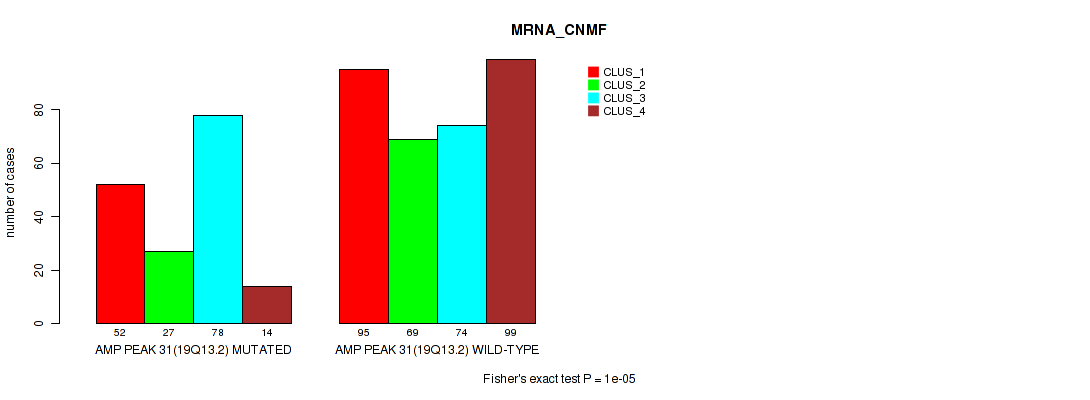 amp_19q13.2 cnv correlated to 'MRNA_CNMF', 'MRNA_CHIERARCHICAL', 'MIR_CHIERARCHICAL', 'CN_CNMF', 'METHLYATION_CNMF', 'MRNASEQ_CNMF', 'MRNASEQ_CHIERARCHICAL', 'MIRSEQ_CNMF', 'MIRSEQ_CHIERARCHICAL', 'MIRSEQ_MATURE_CNMF', and 'MIRSEQ_MATURE_CHIERARCHICAL'.