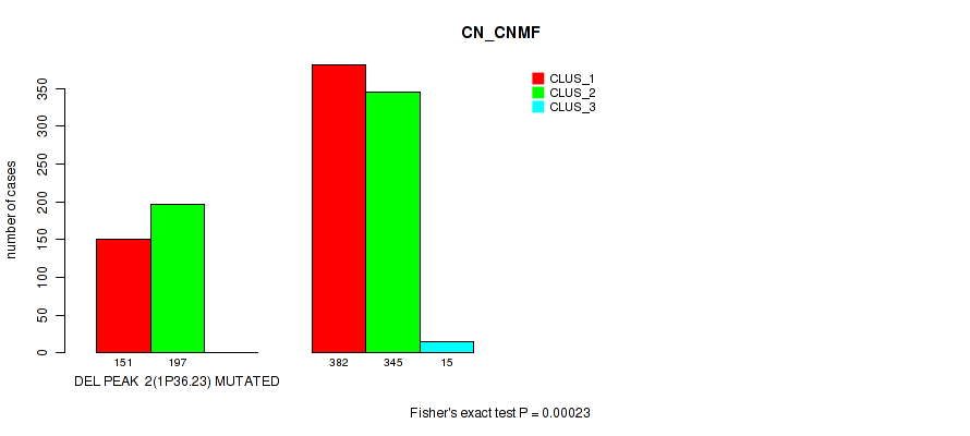 del_1p36.23 cnv correlated to 'CN_CNMF', 'METHLYATION_CNMF', 'MRNASEQ_CNMF', 'MRNASEQ_CHIERARCHICAL', 'MIRSEQ_CNMF', 'MIRSEQ_CHIERARCHICAL', 'MIRSEQ_MATURE_CNMF', and 'MIRSEQ_MATURE_CHIERARCHICAL'.