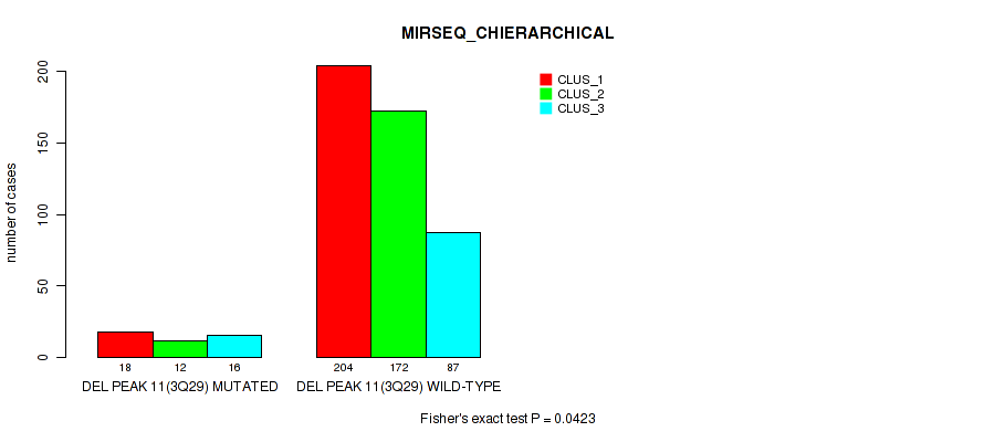 del_3q29 cnv correlated to 'METHLYATION_CNMF', 'MRNASEQ_CHIERARCHICAL', and 'MIRSEQ_CHIERARCHICAL'.