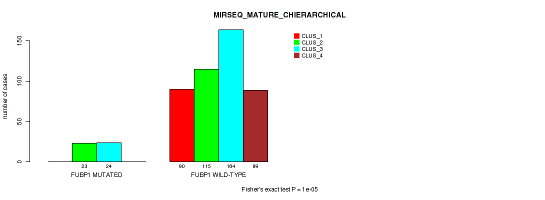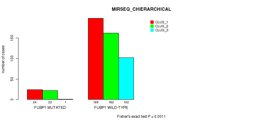FUBP1 mutation correlated to 'CN_CNMF', 'METHLYATION_CNMF', 'MRNASEQ_CNMF', 'MRNASEQ_CHIERARCHICAL', 'MIRSEQ_CNMF', 'MIRSEQ_CHIERARCHICAL', 'MIRSEQ_MATURE_CNMF', and 'MIRSEQ_MATURE_CHIERARCHICAL'.