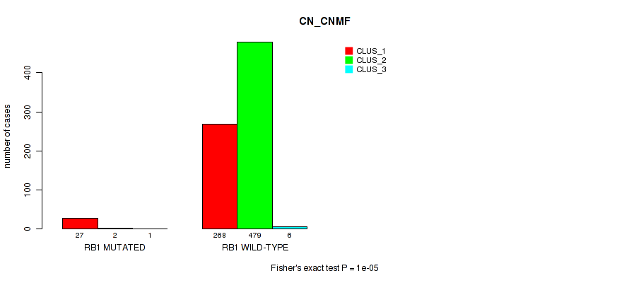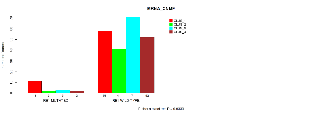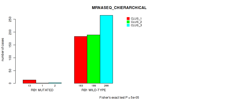 RB1 mutation correlated to 'MRNA_CHIERARCHICAL', 'CN_CNMF', 'METHLYATION_CNMF', 'MRNASEQ_CNMF', and 'MRNASEQ_CHIERARCHICAL'.