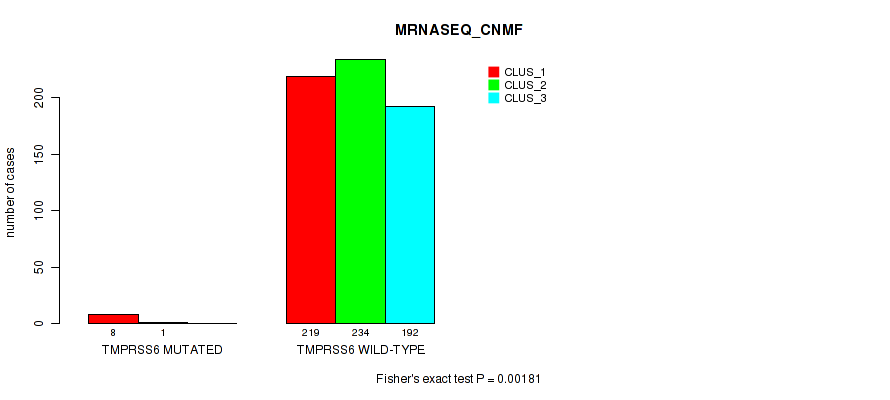 TMPRSS6 mutation correlated to 'MRNASEQ_CNMF' and 'MRNASEQ_CHIERARCHICAL'.