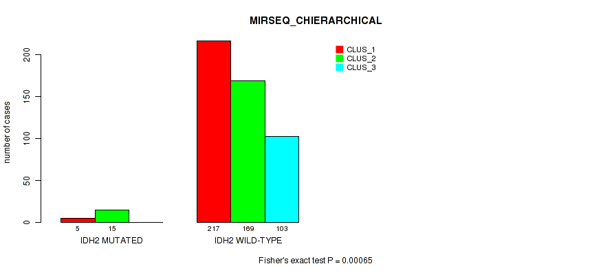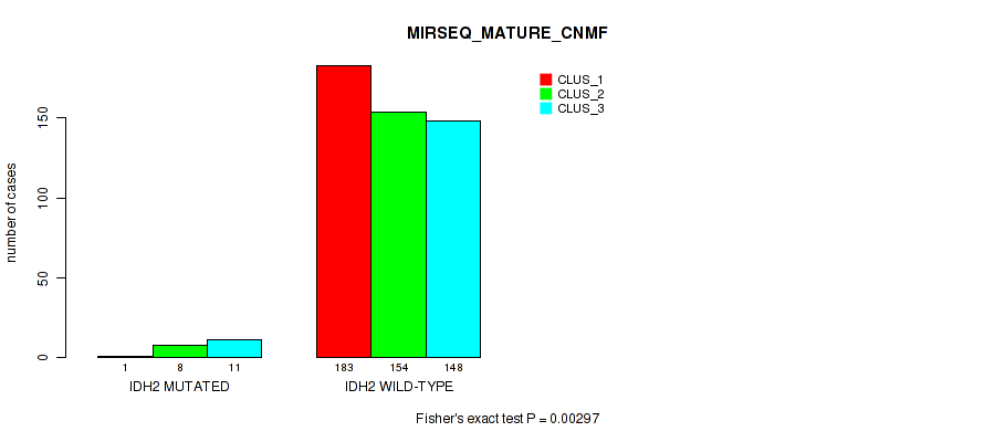 IDH2 mutation correlated to 'CN_CNMF', 'METHLYATION_CNMF', 'MRNASEQ_CNMF', 'MRNASEQ_CHIERARCHICAL', 'MIRSEQ_CNMF', 'MIRSEQ_CHIERARCHICAL', and 'MIRSEQ_MATURE_CNMF'.