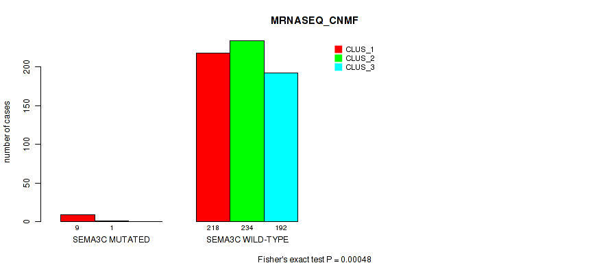 SEMA3C mutation correlated to 'CN_CNMF', 'MRNASEQ_CNMF', and 'MRNASEQ_CHIERARCHICAL'.