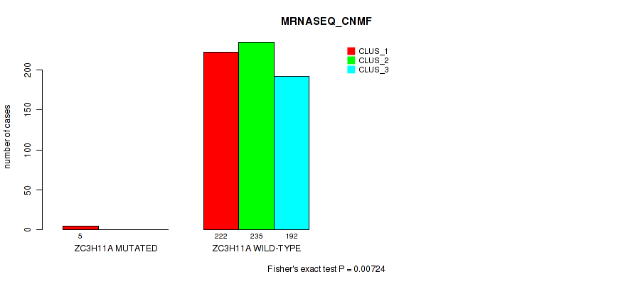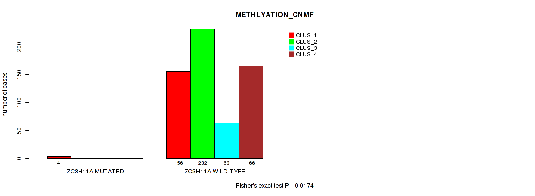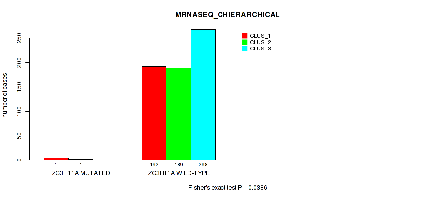 ZC3H11A mutation correlated to 'METHLYATION_CNMF', 'MRNASEQ_CNMF', and 'MIRSEQ_CHIERARCHICAL'.