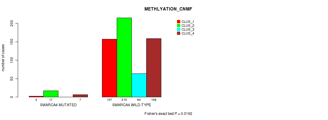 SMARCA4 mutation correlated to 'CN_CNMF', 'METHLYATION_CNMF', 'MRNASEQ_CNMF', and 'MRNASEQ_CHIERARCHICAL'.