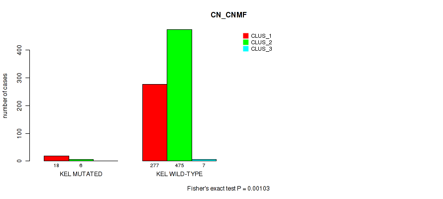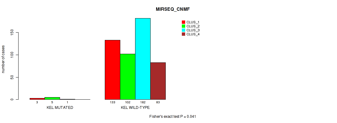 KEL mutation correlated to 'CN_CNMF', 'METHLYATION_CNMF', 'MRNASEQ_CNMF', 'MRNASEQ_CHIERARCHICAL', 'MIRSEQ_CHIERARCHICAL', and 'MIRSEQ_MATURE_CHIERARCHICAL'.