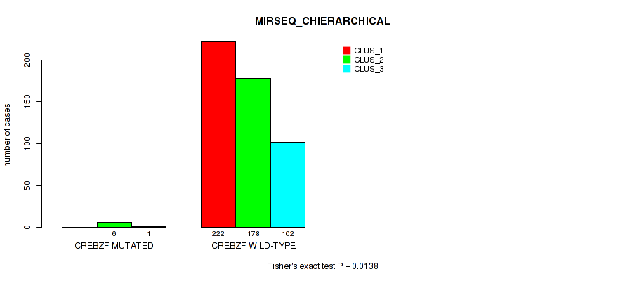 CREBZF mutation correlated to 'METHLYATION_CNMF' and 'MIRSEQ_CHIERARCHICAL'.