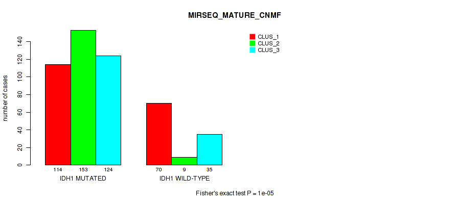 IDH1 mutation correlated to 'MRNA_CNMF', 'MRNA_CHIERARCHICAL', 'MIR_CNMF', 'MIR_CHIERARCHICAL', 'CN_CNMF', 'METHLYATION_CNMF', 'MRNASEQ_CNMF', 'MRNASEQ_CHIERARCHICAL', 'MIRSEQ_CNMF', 'MIRSEQ_CHIERARCHICAL', 'MIRSEQ_MATURE_CNMF', and 'MIRSEQ_MATURE_CHIERARCHICAL'.