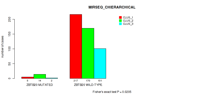ZBTB20 mutation correlated to 'CN_CNMF', 'METHLYATION_CNMF', 'MRNASEQ_CNMF', 'MRNASEQ_CHIERARCHICAL', and 'MIRSEQ_CHIERARCHICAL'.