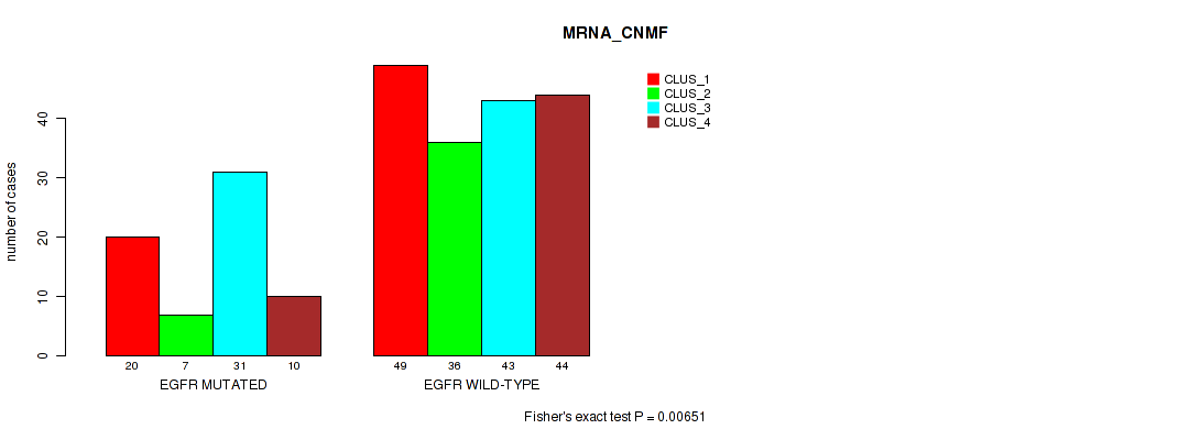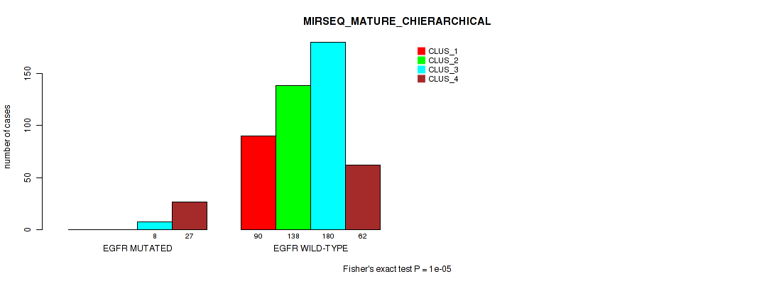 EGFR mutation correlated to 'MRNA_CNMF', 'CN_CNMF', 'METHLYATION_CNMF', 'MRNASEQ_CNMF', 'MRNASEQ_CHIERARCHICAL', 'MIRSEQ_CNMF', 'MIRSEQ_CHIERARCHICAL', 'MIRSEQ_MATURE_CNMF', and 'MIRSEQ_MATURE_CHIERARCHICAL'.