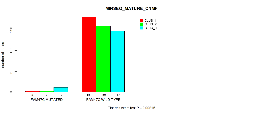 FAM47C mutation correlated to 'MRNASEQ_CHIERARCHICAL', 'MIRSEQ_MATURE_CNMF', and 'MIRSEQ_MATURE_CHIERARCHICAL'.