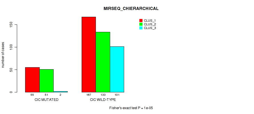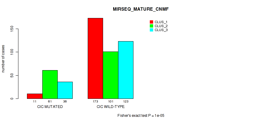 CIC mutation correlated to 'CN_CNMF', 'METHLYATION_CNMF', 'MRNASEQ_CNMF', 'MRNASEQ_CHIERARCHICAL', 'MIRSEQ_CNMF', 'MIRSEQ_CHIERARCHICAL', 'MIRSEQ_MATURE_CNMF', and 'MIRSEQ_MATURE_CHIERARCHICAL'.