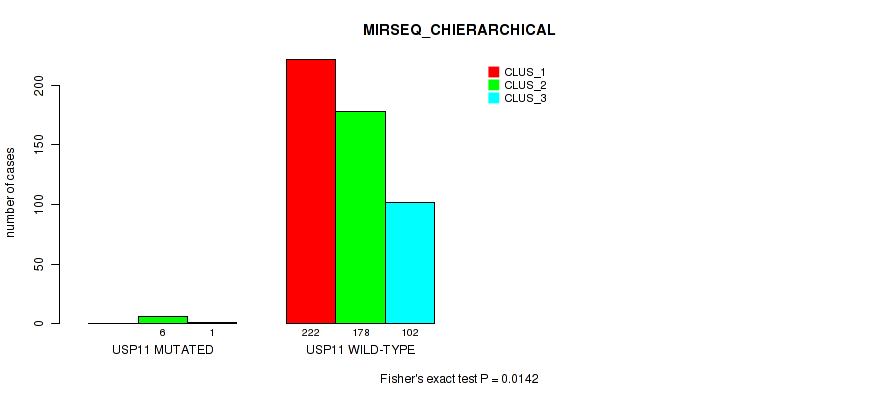 USP11 mutation correlated to 'MRNASEQ_CNMF', 'MIRSEQ_CHIERARCHICAL', and 'MIRSEQ_MATURE_CHIERARCHICAL'.
