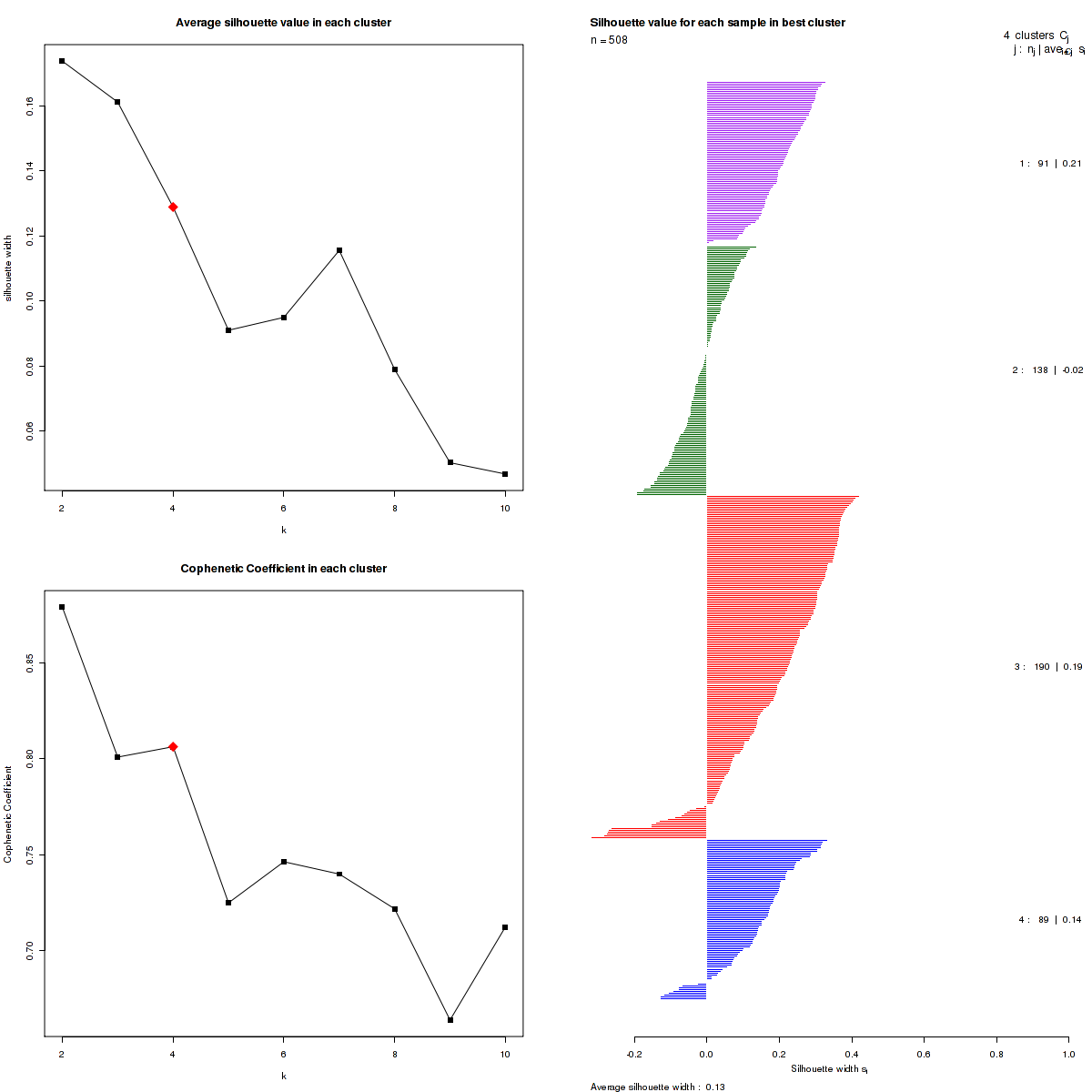 The cophenetic correlation coefficients and average silhouette values are used to determine the k with the most robust clusterings. From the plot of cophenetic correlation versus k, we select modes and the the point preceding the greatest decrease in cophenetic correlation coefficient, and from these choose the k with the highest average silhouette value.