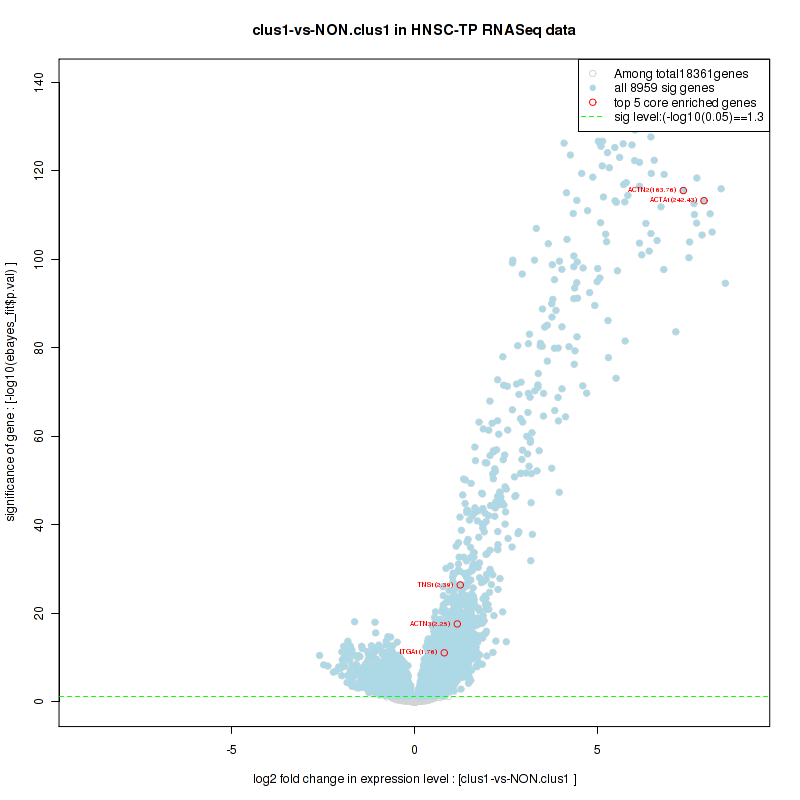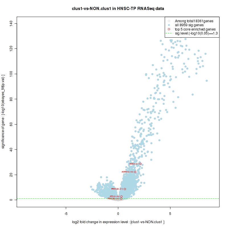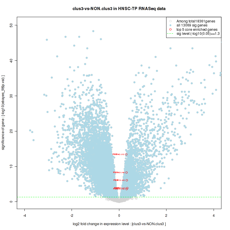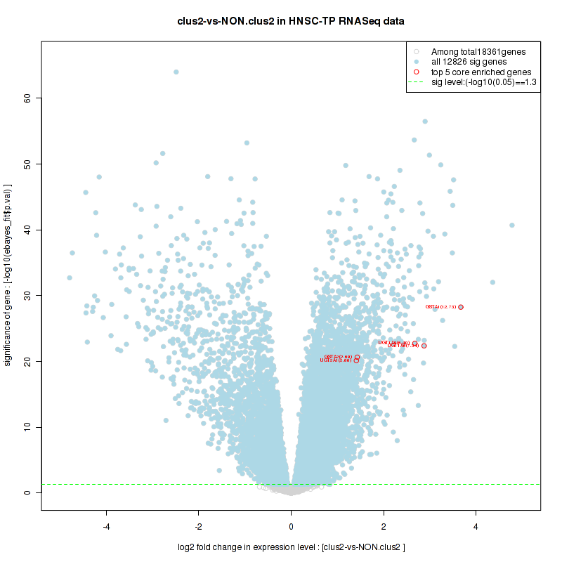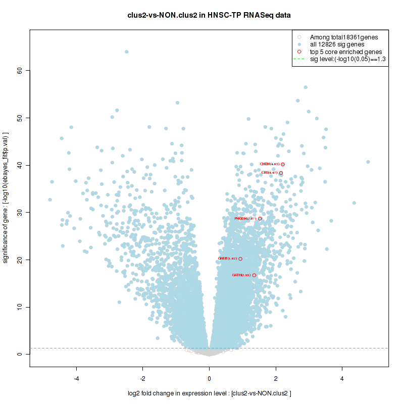 Figure S2.  Get High-res Image For the top 5 core enriched genes in the pathway: BIOCARTA NO1 PATHWAY, this volcano plot shows how much they are up/down-regulated and significant. The significance was calculated by empirical bayesian fit