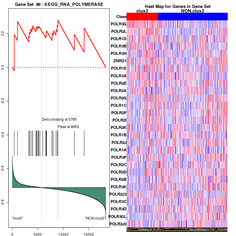 Figure S59.  Get High-res Image This plot shows mRNAseq_cNMF expression data heatmap (on the left) a RunningEnrichmentScore(RES) plot (on the top right) and a Signal2Noise(S2N) plot (on the bottom right) of genes in the pathway: KEGG RNA POLYMERASE.