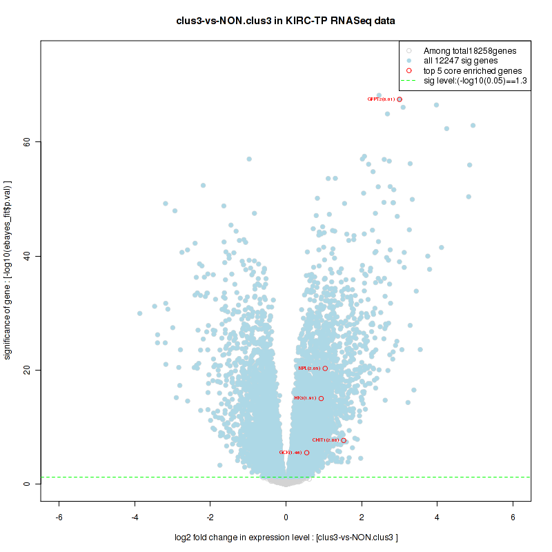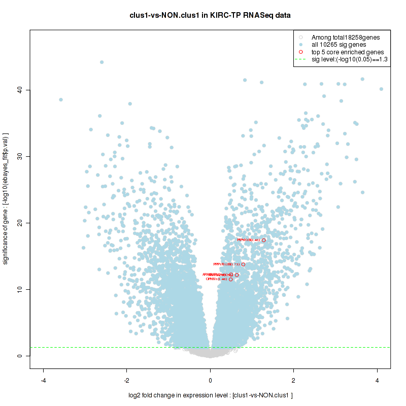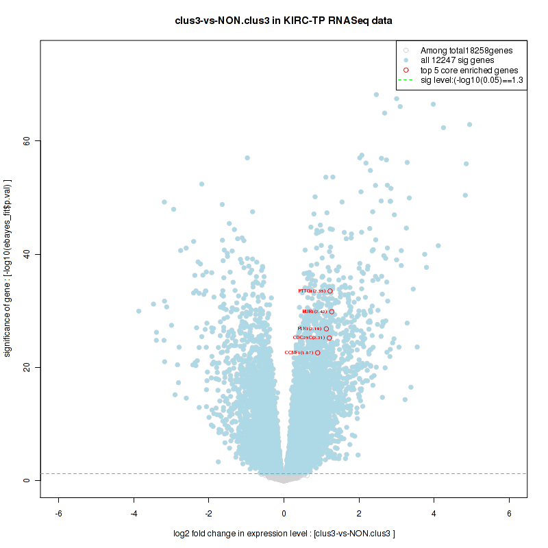 Figure S2. Get High-res Image For the top 5 core enriched genes in the pathway: BIOCARTA NO1 PATHWAY, this volcano plot shows how much they are up/down-regulated and significant. The significance was calculated by empirical bayesian fit