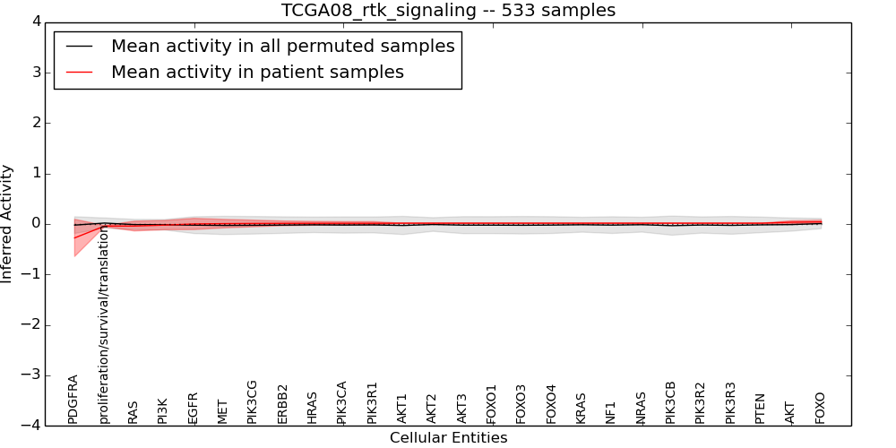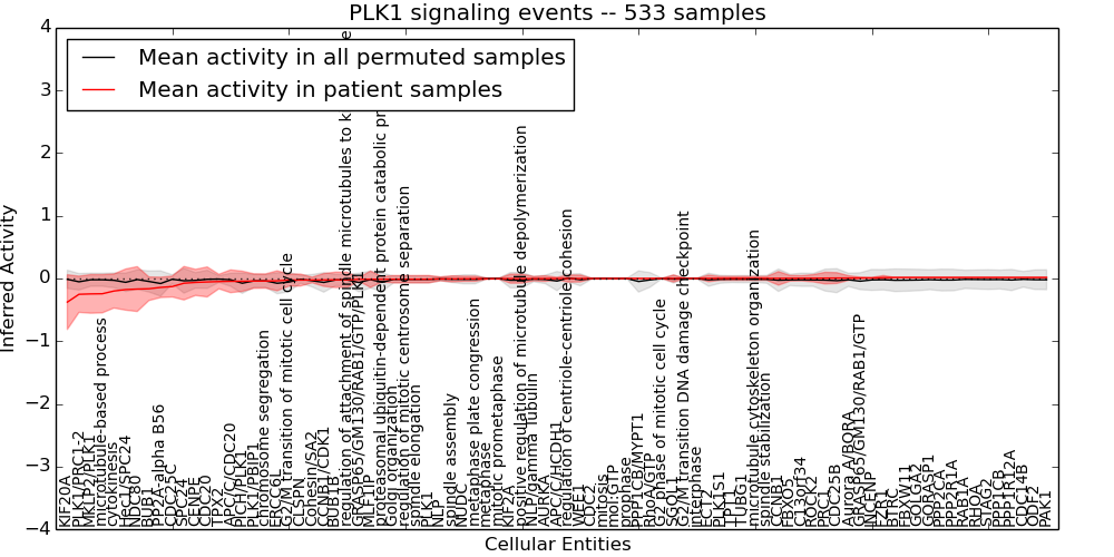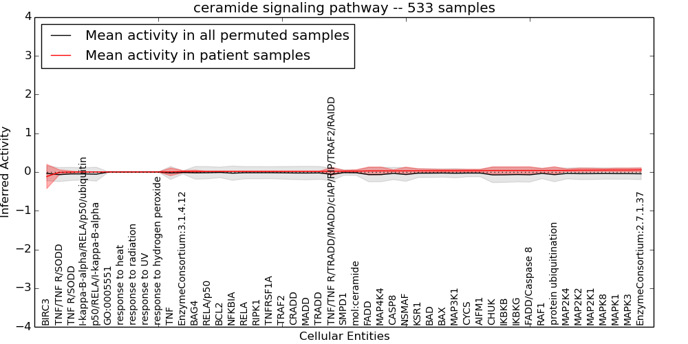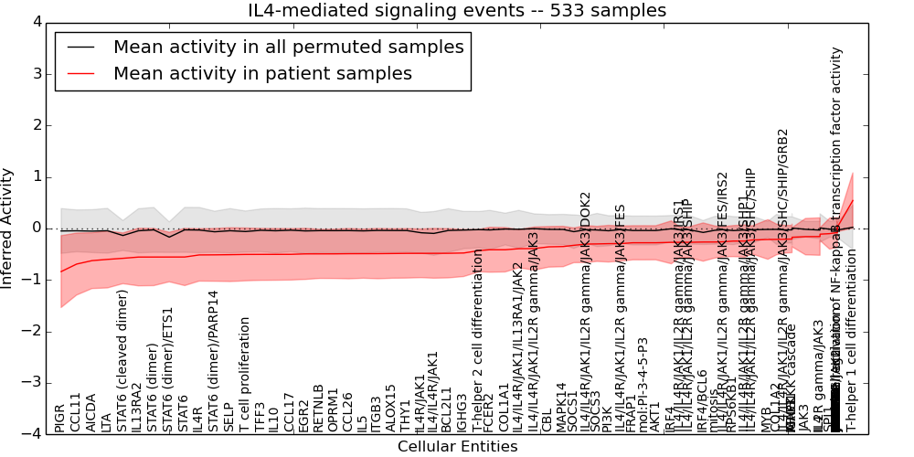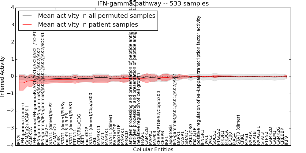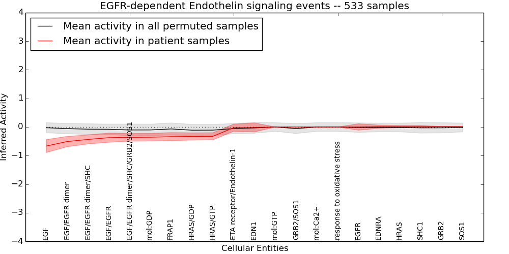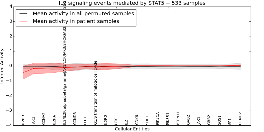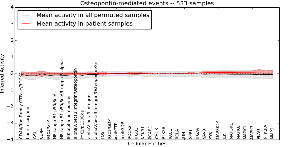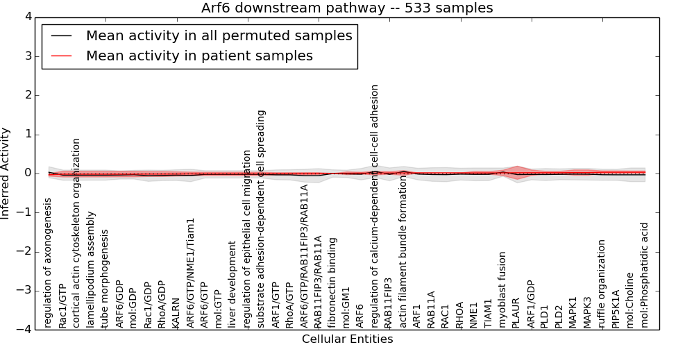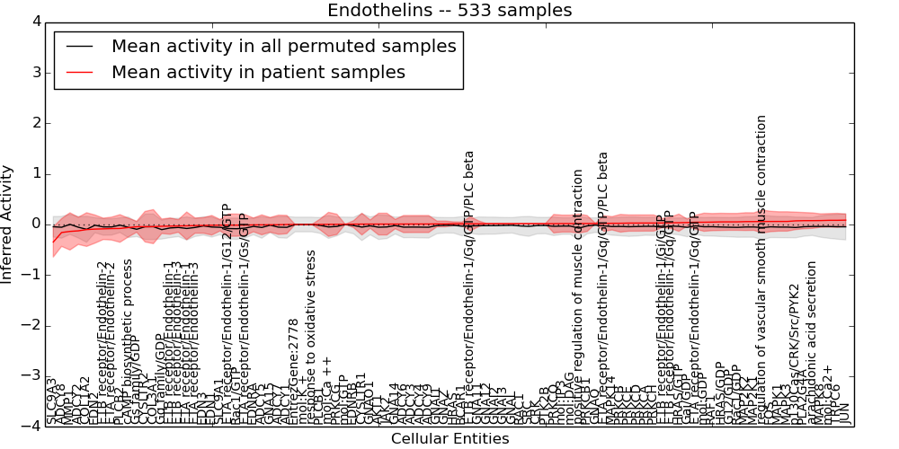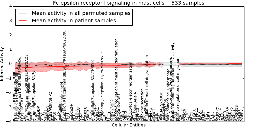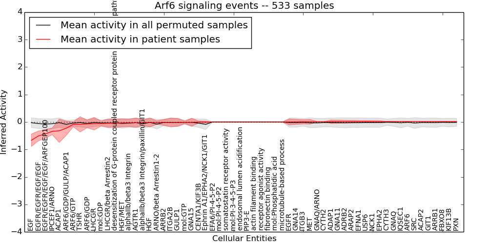 Figure S131. Get High-res Image This plot shows pathway concept perturbations across all samples against a permutation model. The concepts along the x-axis are sorted by lowest to highest mean activity for the real patient samples. Mean inferred activities are plotted along the y-axis as a colored band showing the average level and one standard deviation range. Real samples are shown in red and permuted samples in black.
