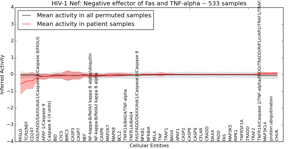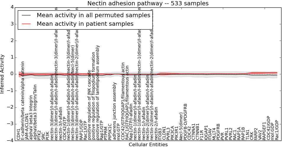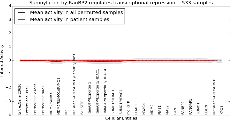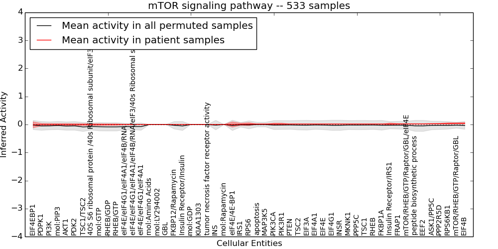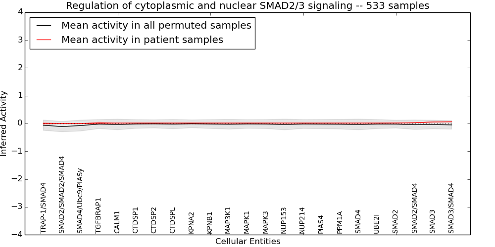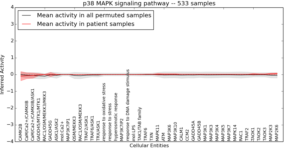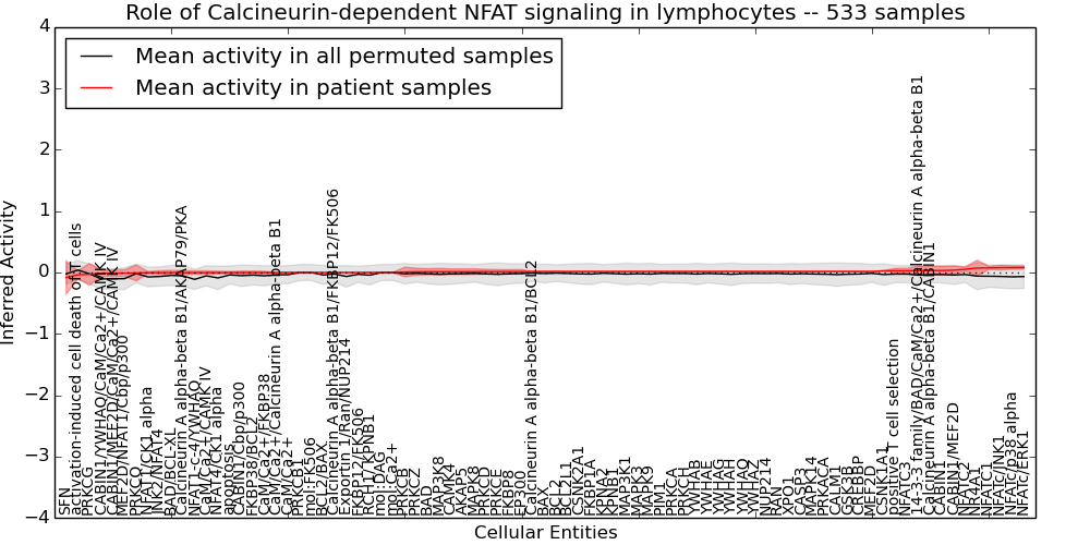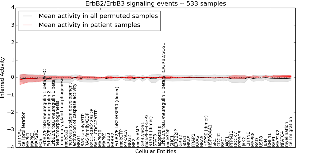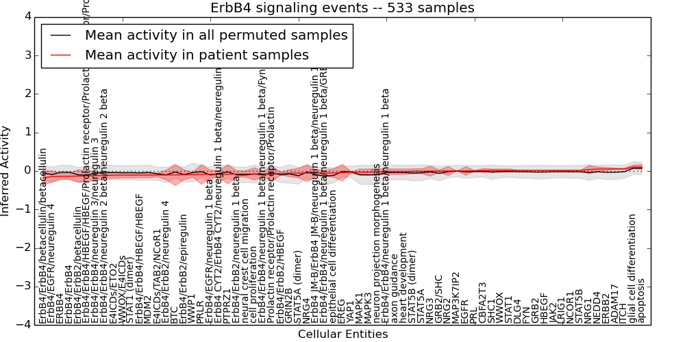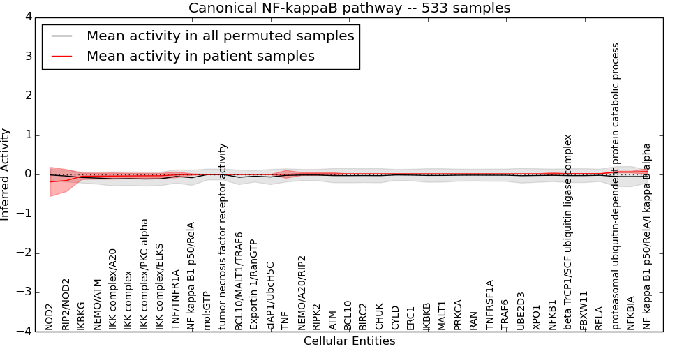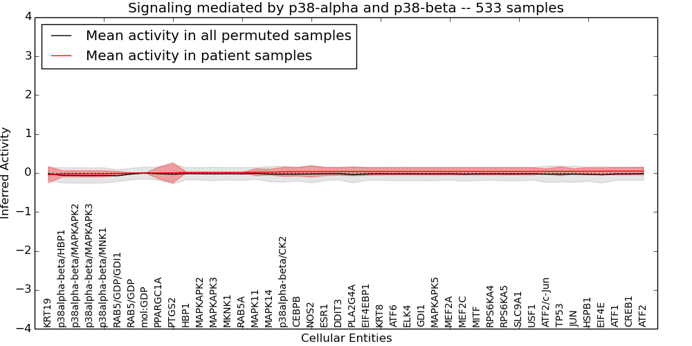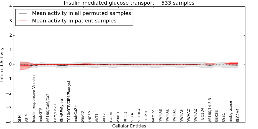 Figure S131. Get High-res Image This plot shows pathway concept perturbations across all samples against a permutation model. The concepts along the x-axis are sorted by lowest to highest mean activity for the real patient samples. Mean inferred activities are plotted along the y-axis as a colored band showing the average level and one standard deviation range. Real samples are shown in red and permuted samples in black.
