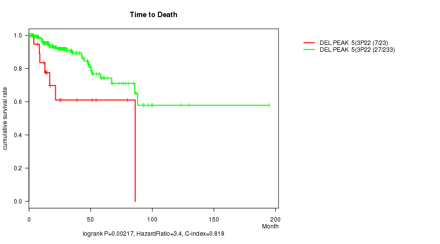 del_3p22.1 cnv correlated to 'Time to Death', 'YEARS_TO_BIRTH', 'NEOPLASM_DISEASESTAGE', 'PATHOLOGY_T_STAGE', and 'PATHOLOGY_N_STAGE'.