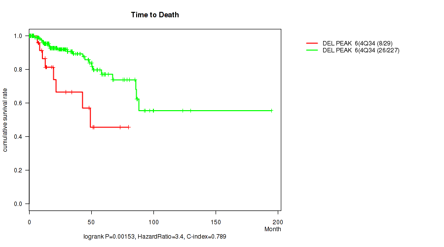 del_4q34.3 cnv correlated to 'Time to Death', 'NEOPLASM_DISEASESTAGE', 'PATHOLOGY_T_STAGE', 'GENDER', and 'RACE'.