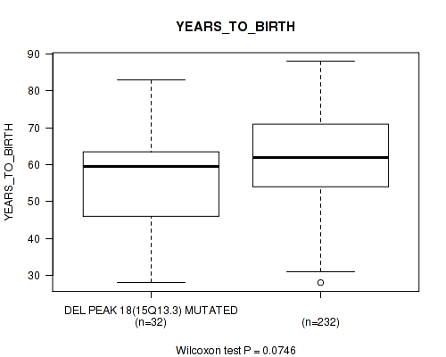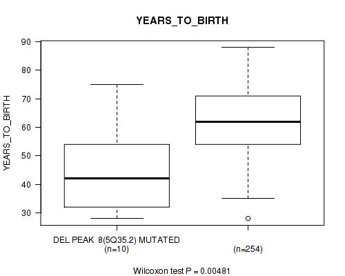 Table S122. Gene #31: 'del_xq28' versus Clinical Feature #2: 'YEARS_TO_BIRTH'
