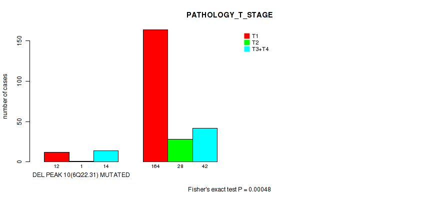 del_6q22.31 cnv correlated to 'NEOPLASM_DISEASESTAGE', 'PATHOLOGY_T_STAGE', 'PATHOLOGY_N_STAGE', and 'GENDER'.