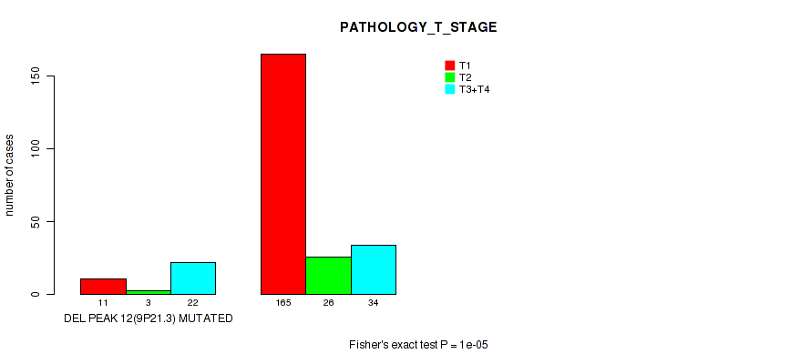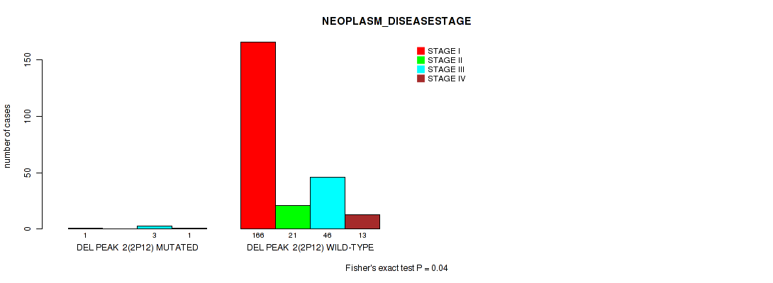 del_2p12 cnv correlated to 'NEOPLASM_DISEASESTAGE' and 'PATHOLOGY_T_STAGE'.