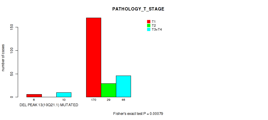 del_10q21.1 cnv correlated to 'NEOPLASM_DISEASESTAGE', 'PATHOLOGY_T_STAGE', and 'PATHOLOGY_N_STAGE'.