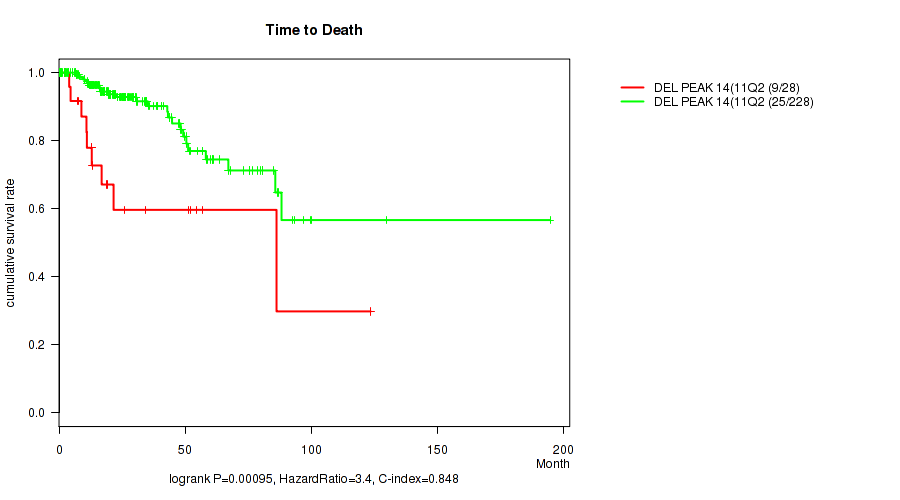 del_14q11.2 cnv correlated to 'Time to Death', 'NEOPLASM_DISEASESTAGE', 'PATHOLOGY_T_STAGE', 'PATHOLOGY_N_STAGE', and 'GENDER'.