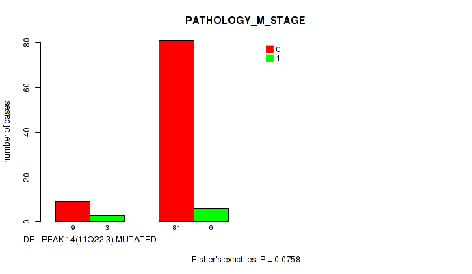 Table S113. Gene #29: 'del_22q12.2' versus Clinical Feature #6: 'PATHOLOGY_M_STAGE'