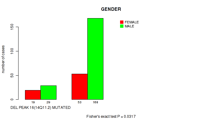 Figure S119. Get High-res Image Gene #30: 'del_xp11.4' versus Clinical Feature #7: 'GENDER'
