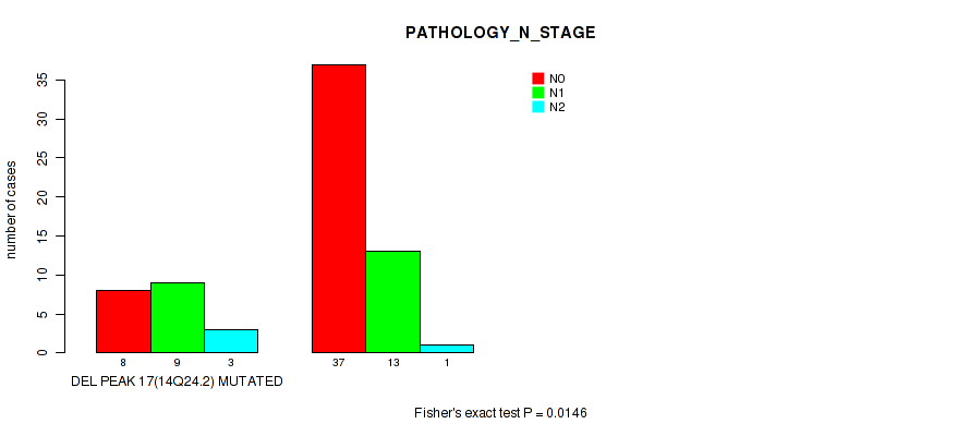 del_14q24.2 cnv correlated to 'Time to Death', 'NEOPLASM_DISEASESTAGE', 'PATHOLOGY_T_STAGE', 'PATHOLOGY_N_STAGE', 'GENDER', 'KARNOFSKY_PERFORMANCE_SCORE', and 'YEAR_OF_TOBACCO_SMOKING_ONSET'.