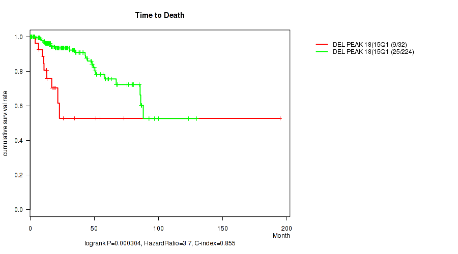 del_15q13.3 cnv correlated to 'Time to Death', 'YEARS_TO_BIRTH', 'NEOPLASM_DISEASESTAGE', 'PATHOLOGY_T_STAGE', 'PATHOLOGY_N_STAGE', and 'KARNOFSKY_PERFORMANCE_SCORE'.