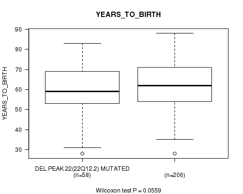 Figure S109. Get High-res Image Gene #29: 'del_22q12.2' versus Clinical Feature #2: 'YEARS_TO_BIRTH'