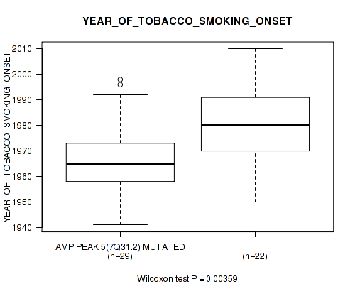 amp_7q31.2 cnv correlated to 'NEOPLASM_DISEASESTAGE', 'PATHOLOGY_T_STAGE', 'GENDER', 'KARNOFSKY_PERFORMANCE_SCORE', and 'YEAR_OF_TOBACCO_SMOKING_ONSET'.